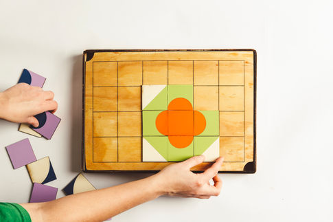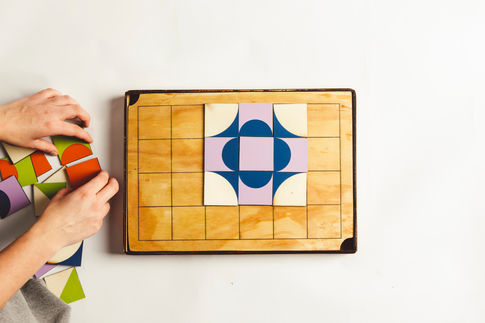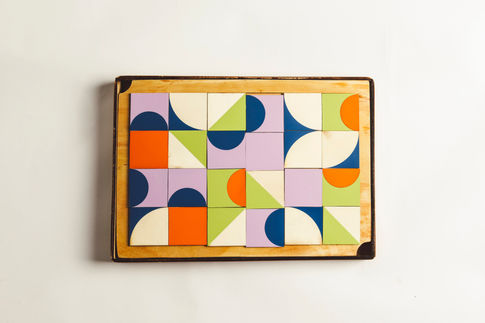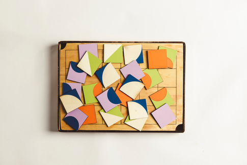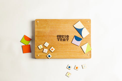 The tray features a dual-purpose activity piece: one side offers an educational activity, while the other invites more creative play. The activity piece was designed to fit within the tray's frame, with quarter-circle cutouts in opposite corners for easy access to flip it over. Beneath the activity piece, a divider separates two sections—one for storing puzzle pieces and the other for memory game pieces. The underneath for these trays will differ depending on the activites they offer.